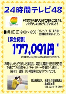 8月31日(日)チャレンジャー燕三条店様前での街頭募金と、本会各窓口にてお預かりの募金を合わせた総額177,091円は、全額を24時間テレビチャリティー委員会へお送りしました。 今後、この募金は同委員会を通じて、障がい者スポーツの支援、環境保護活動の支援、自然災害被災地の復興支援などに役立てられます。 皆さまからのあたたかいご協力に、心より感謝申し上げます。