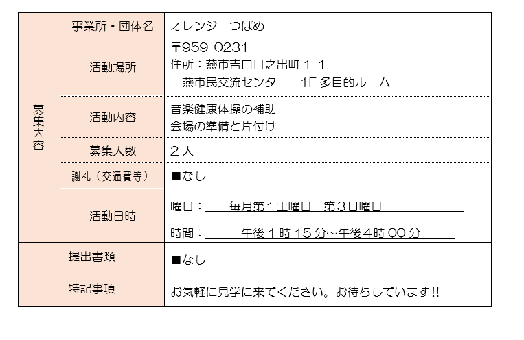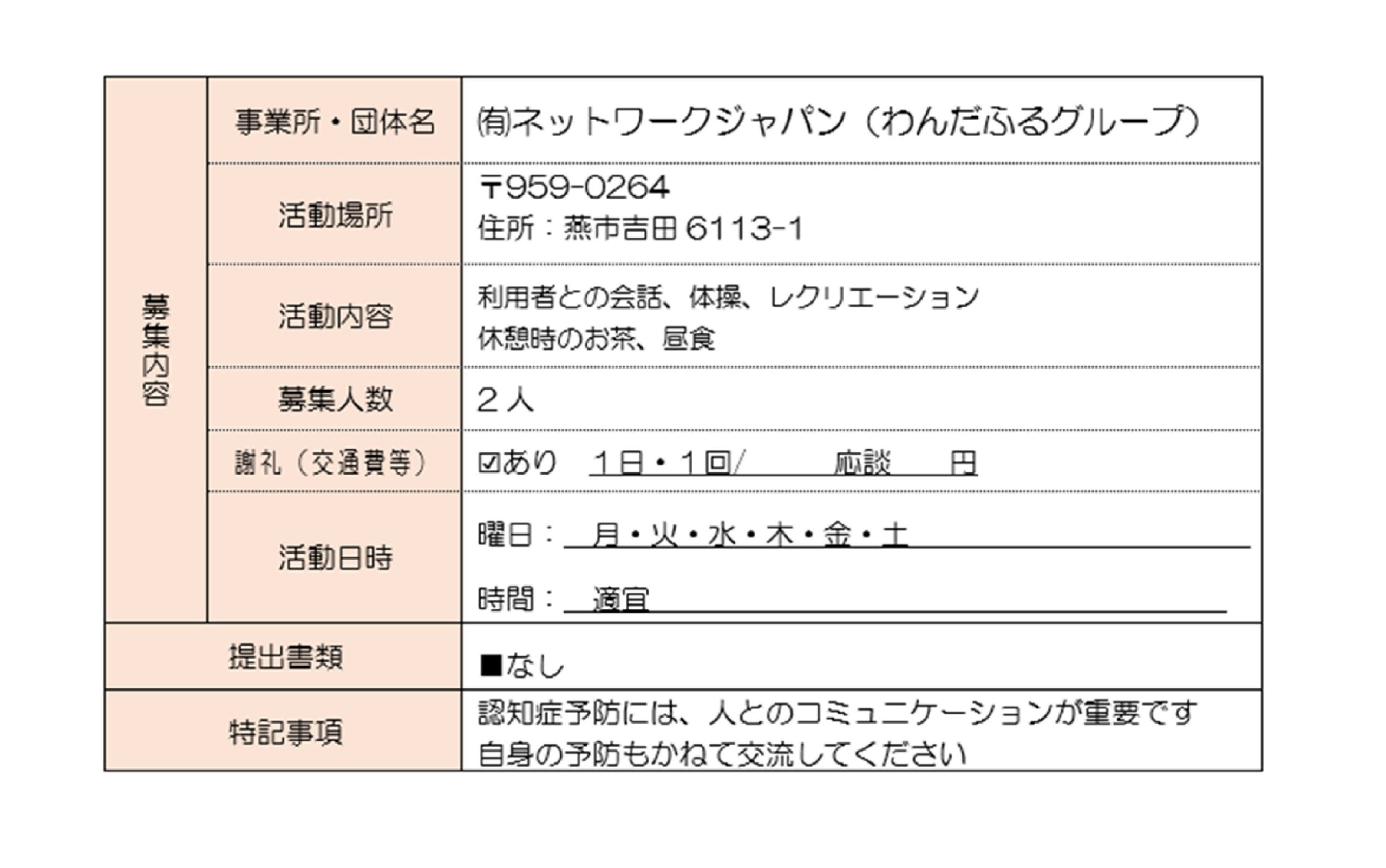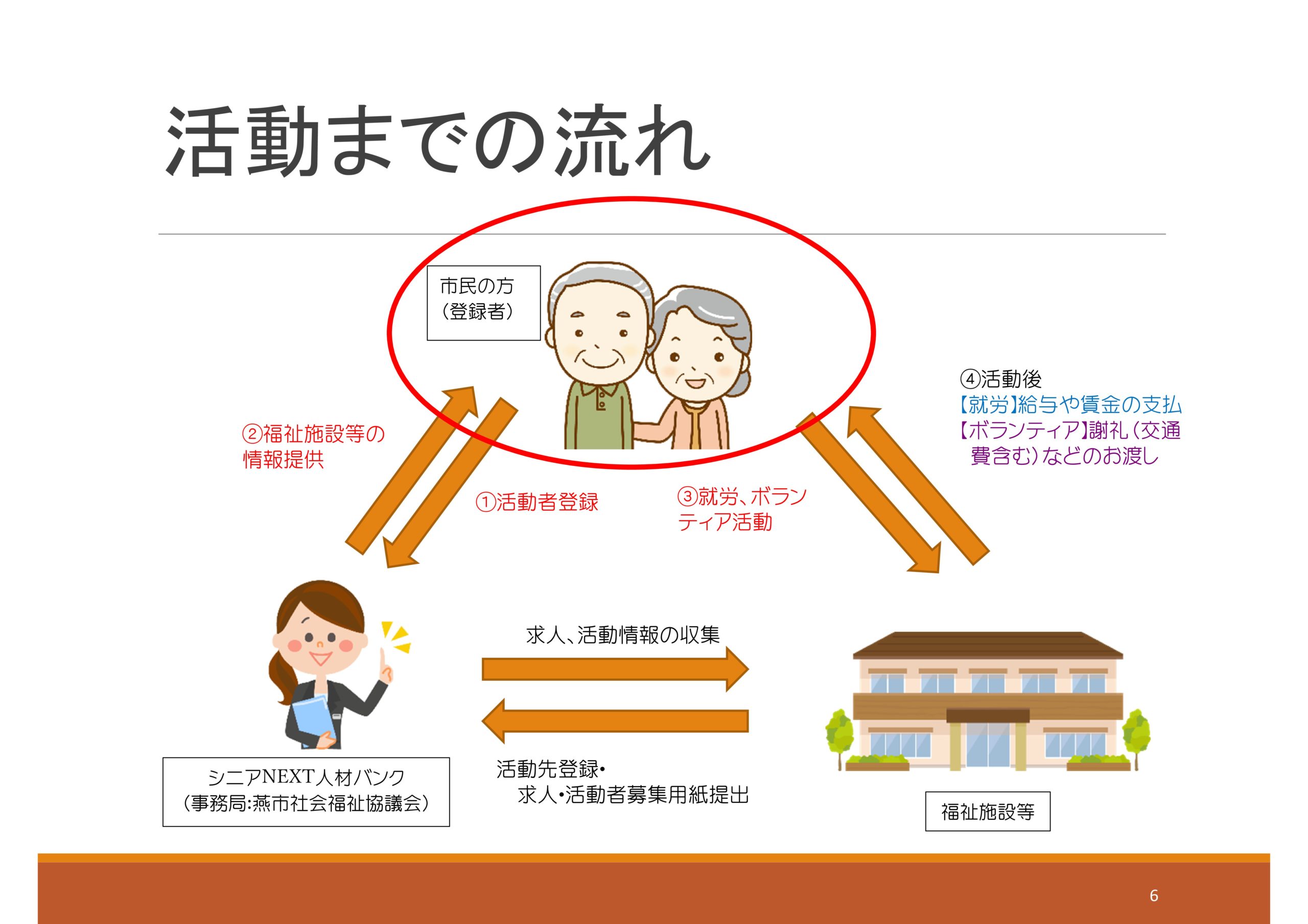 燕市シニアNEXT人材バンクは、就労的活動※を希望するおおむね60歳以上の燕市民の方と燕市内で活動の場を提供する福祉施設等をマッチングし、高齢者等の社会参加の促進と地域の人手不足の解消等を目指します。