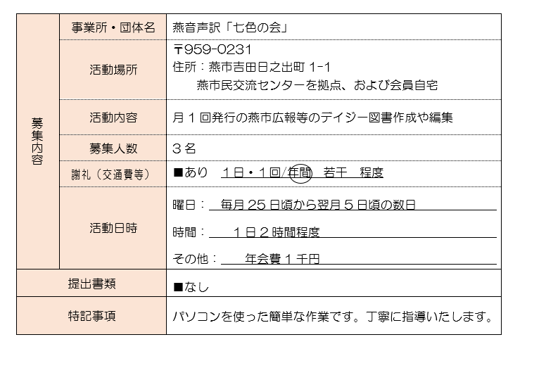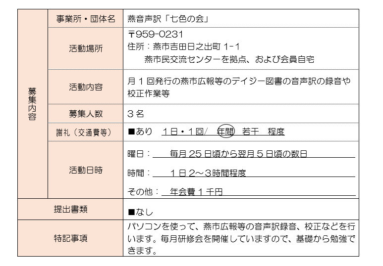 シニアNEXT人材バンクに登録した方(燕市民)は、燕市社会福祉協議会ホームページおよびシニアNEXT人材バンク事務局において福祉施設等の活動内容を閲覧します。