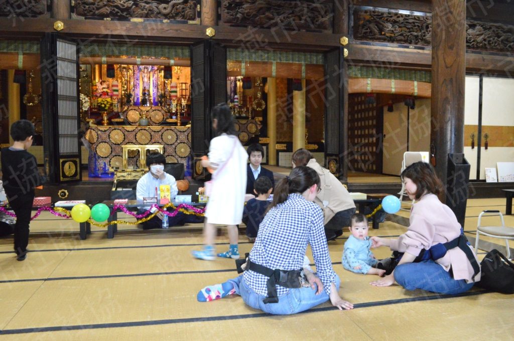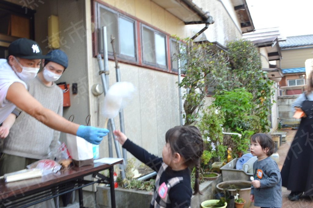 4月18日(金)、新たな試みとして、お弁当販売の前にわたあめとお菓子を配布しました。 当日は、子どもたちが親御さんと一緒にわたあめをもらうとお堂に入り、受付で好きなお菓子と交換できるチケットを受け取り、どれにしようかとお菓子の並んだテーブルの前を行ったり来たりしていました。